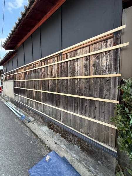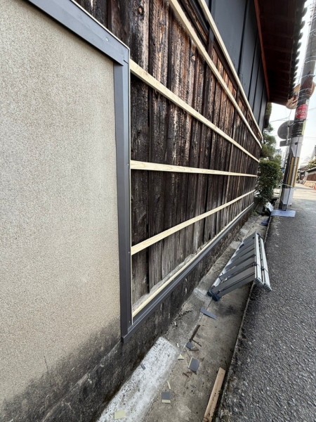 大阪府寝屋川市にて、焼き板外壁をガルバリウム鋼板ヨドプリントでカバー工法しました。